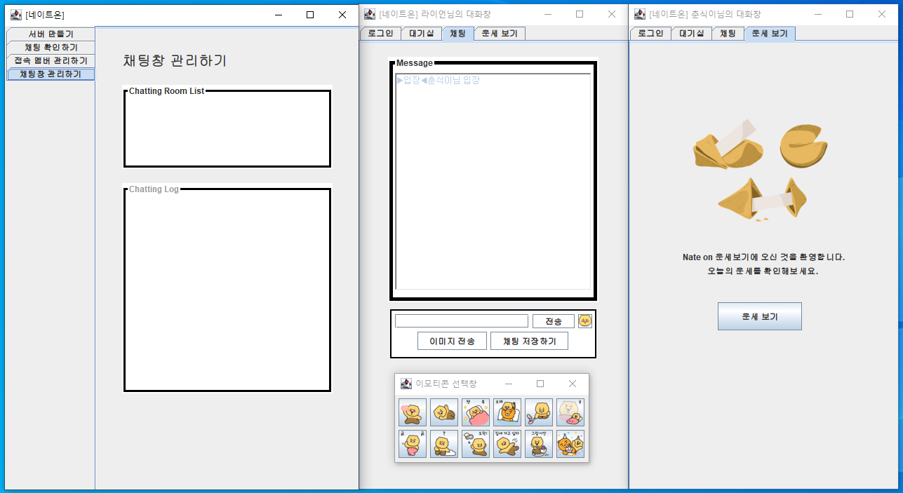 구현된 기능은 아래와 같다. 내가 초등학생 시절 사용하던 추억의 채팅 프로그램, '네이트온'을 다시 구현해보고 싶어, 실제 네이트온의 기능들을 참고하며 작성했다. 운세 기능이나 이모티콘 기능도 그 일부이다.