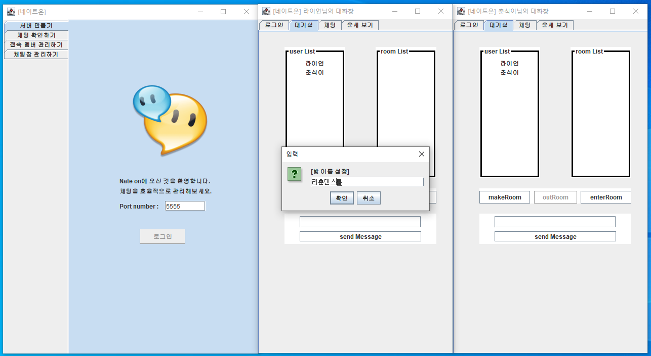 전날 두 시간 내내 붙잡고 있던 이모티콘 전송, 사진 파일 전송, 서버 관리자 기능 추가(방 삭제, 멤버 강퇴, 채팅 로그 읽기 등등), 채팅 로그 저장 등을 구현하고 싶었지만... 시간적인 한계 때문에 모두 구현하지 못했다.
